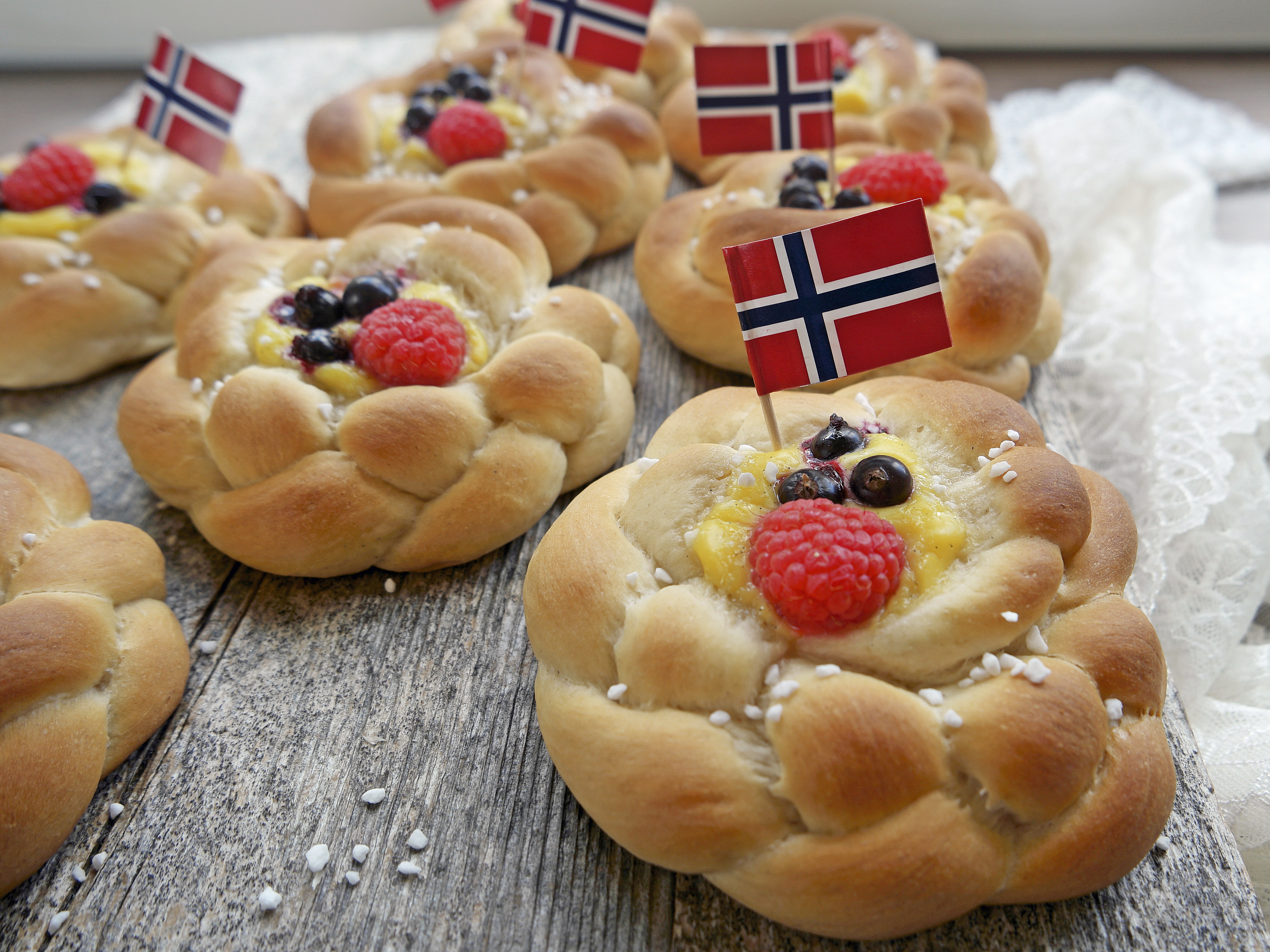 Kaker og boller hører til på 17. mai! Gjærbakst kan du bake dager i forveien og legge i fryseren, så har du en mindre ting å tenke på på den store dagen. I år har jeg fylt fryseren med disse flettebollene som er fylt med vaniljekrem og toppet med bær og hvitt perlesukker. De ser mer avanserte ut enn de er. Om du kan flette helt vanlige fletter, lager du enkelt disse bollene.
