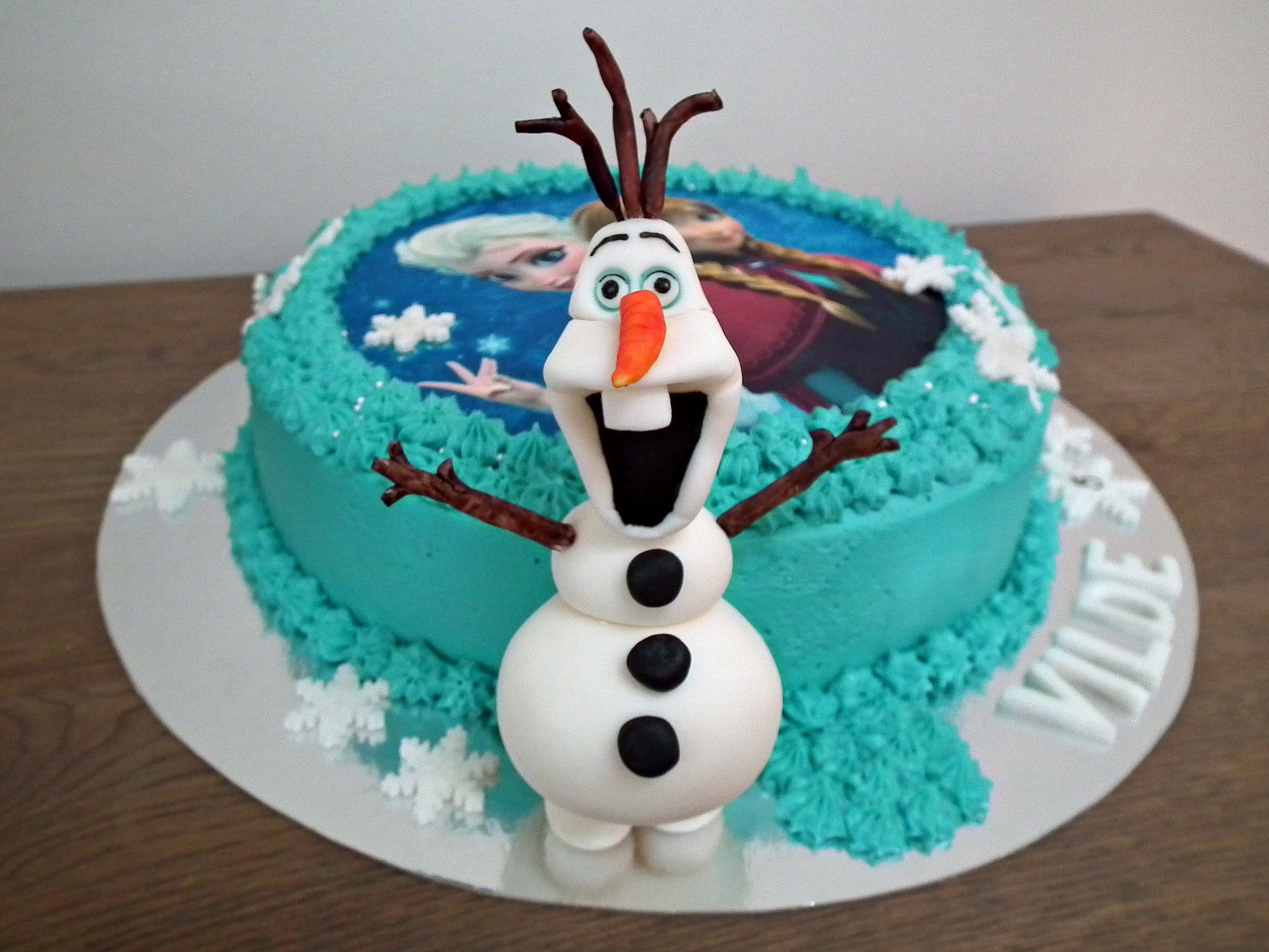 Olaf, snøkrystallene og bokstavene har jeg laget av marshmallowfondant (mmf). Det er et fint alternativ til marsipan, og gjerne litt mer populært hos barn, som ofte ikke liker marsipan. Marshmallowfondanten blir helt hvit, så det er perfekt å modellere Olaf i. På denne kaken skulle Olaf egentlig stå på smørkremen som er sprøytet ut på fatet, men denne kaken ble fraktet i kakeeske, og Olaf var litt for høy for esken og måtte få egen eske under transport. Så han fikk posere ved siden av der han egentlig skulle stå, så han ikke skulle bli skitten før levering.